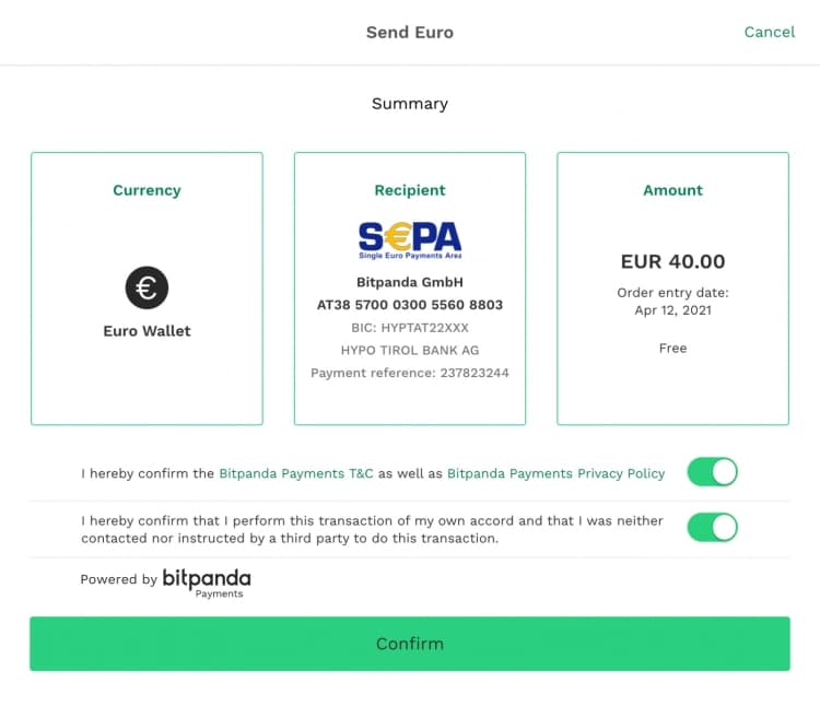 Deze dienst wordt geleverd door Bitpanda Payments, een gelicentieerde dochteronderneming van Bitpanda. Bitpanda Payments is een betalingsdienstverlener onder de Europese PSD 2-verordening en een elektronischgeldinstelling onder de Europese richtlijn voor elektronisch geld. Informatie over onze klachtenprocedure is te vinden.
