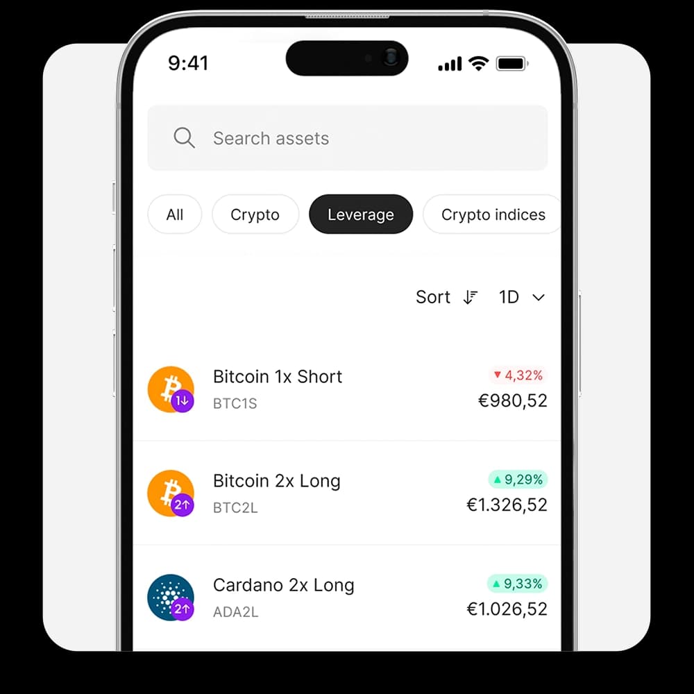 Obține expunere cu efect de levier la Bitcoin, Ethereum și alte criptomonede de top. Dacă prețul Bitcoin crește cu 10 %, prețul Bitcoin/EUR 1x Short va scădea cu 10 %, iar prețul Bitcoin/EUR 2x Long poate crește până la 20 %.